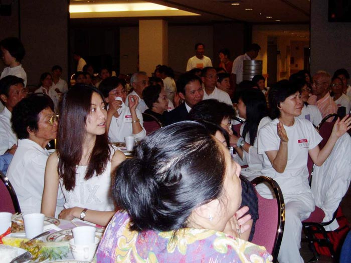 大华府侨界与前来美国参加 和平呼吁活动的台湾法轮功学员相聚,图为观众在观看演出 美国 2003-7-21
