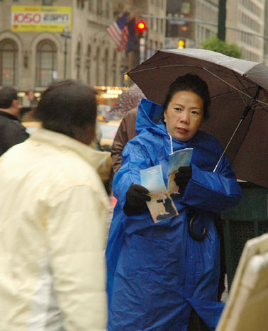 风雨阻挡不了法轮功学员在曼哈顿街头发资料讲真相