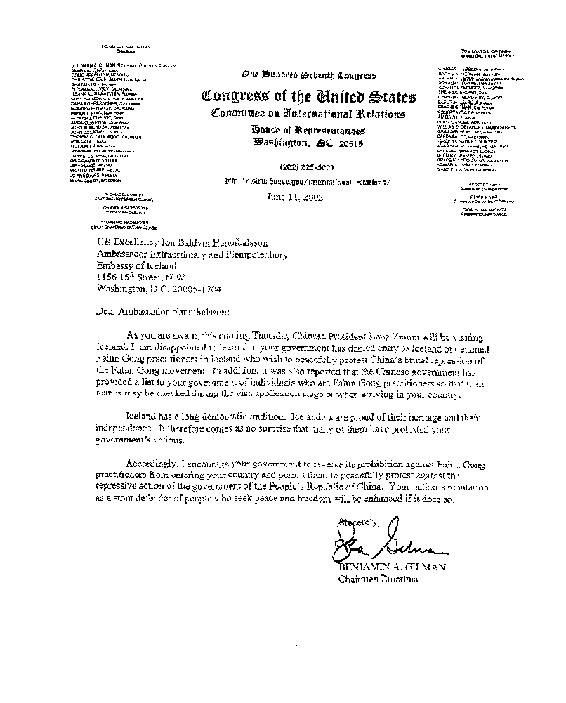 美国国会国际关系委员会名誉主席吉尔曼就冰岛禁止法轮功学员入境事宜致信冰岛驻美国大使