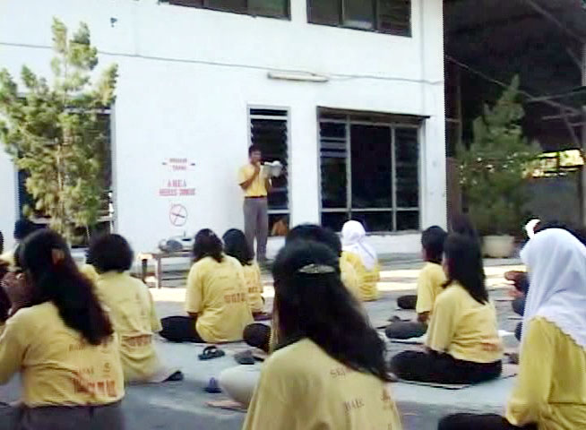 印尼梭罗市200名棉织厂工人一起修炼法轮功,图为工人们集体学法