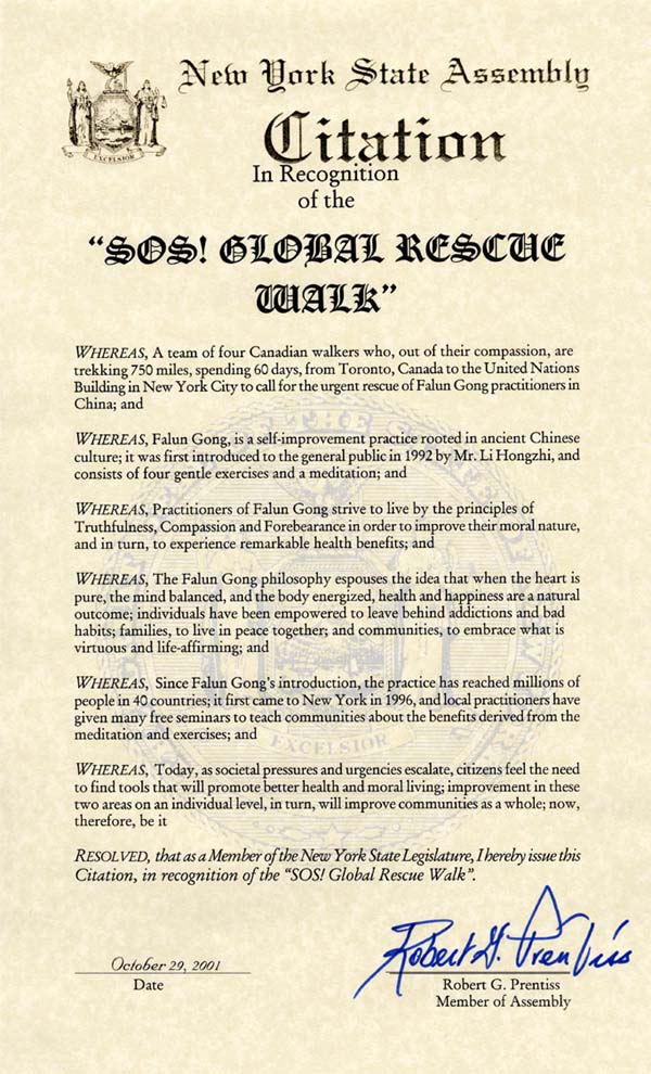 纽约州议员给加拿大蒙特利尔-渥太华-纽约SOS紧急救援步行法轮功学员的褒奖令 美国 纽约 2001-10-29