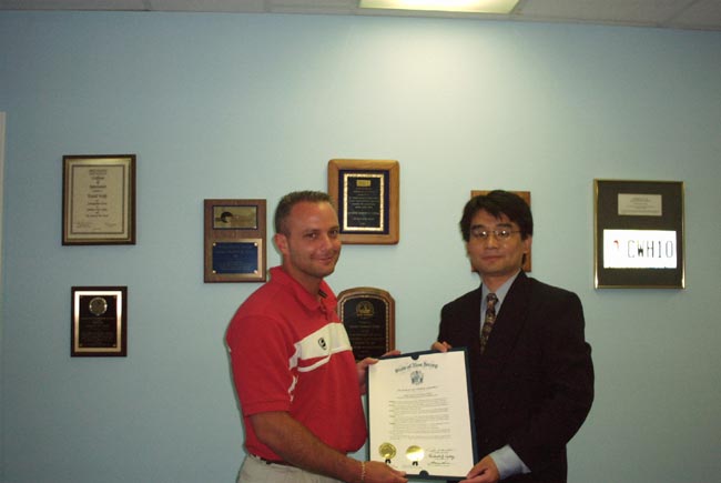 新泽西州参众两院联合签发决议祝贺“法轮大法周”,图为议员颁发褒奖 美国 新泽西 2002-6