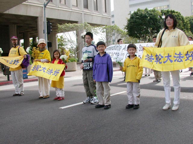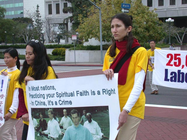 参加美西法会的大法弟子举行新闻发布会呼吁营救李祥春并游行洪法