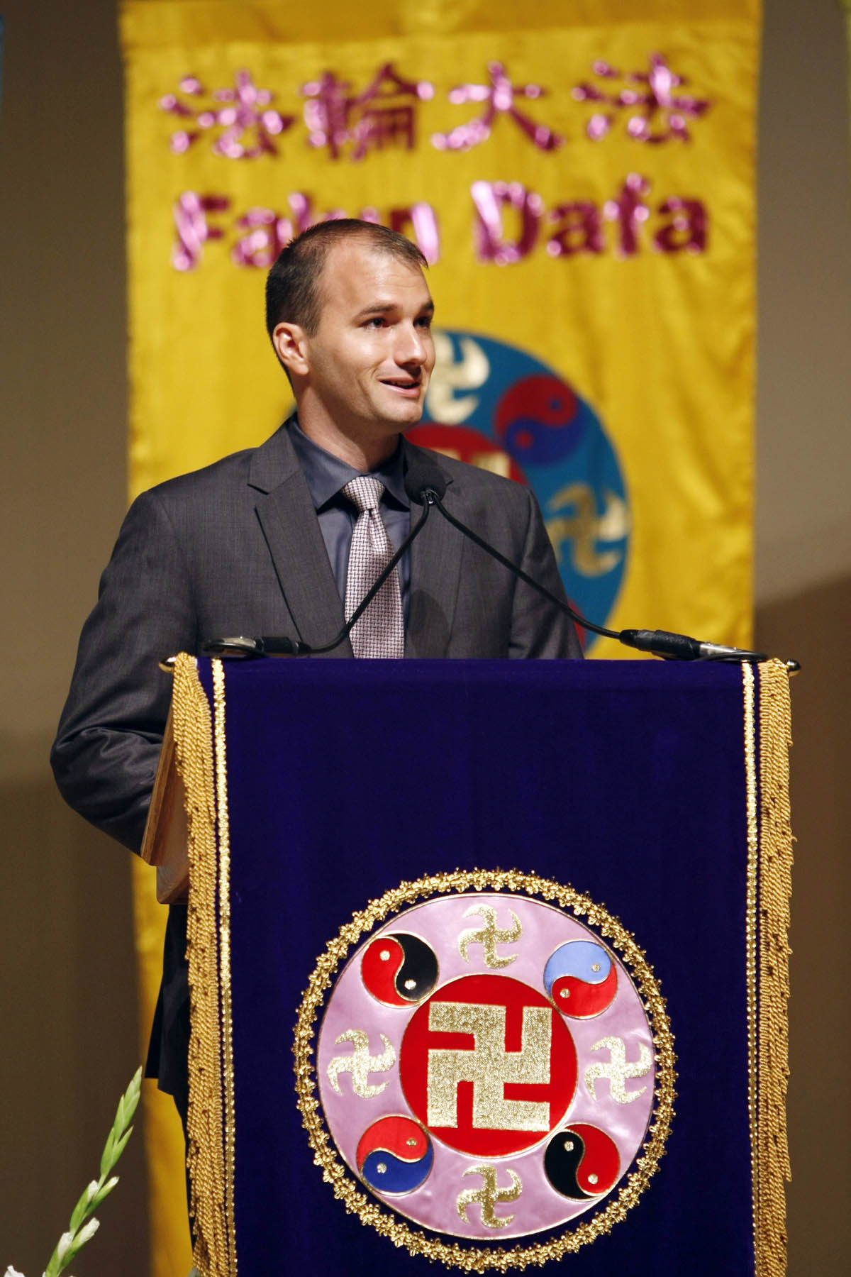 纽约二零零八年法轮大法修炼心得交流会在曼哈顿贾维茨会议中心举行,图为天音乐团指挥陈汝棠发言 2008-5-24