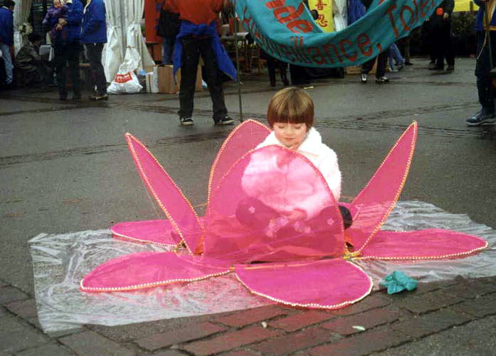法轮功学员参加2002年华盛顿DC樱花节游行期间,小弟子炼功