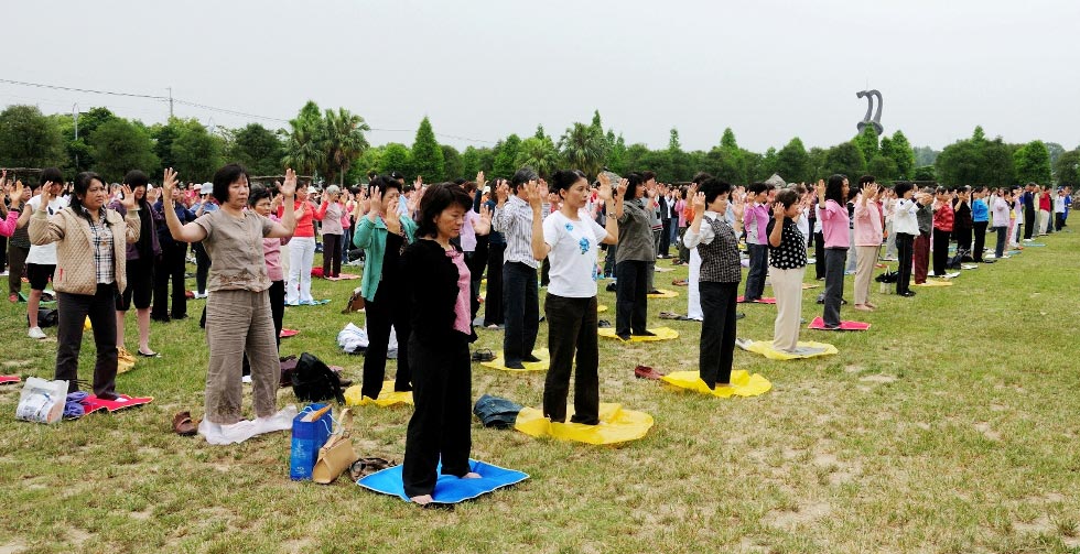 法轮功学员在剑潭活动中心,举办修炼心得交流会图为在草坪上集体晨炼