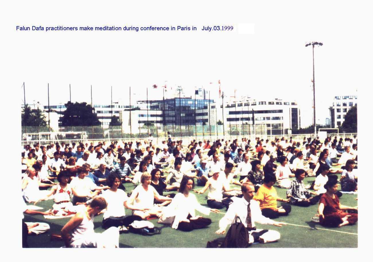 法轮大法欧洲法会期间来自世界各地900百多名法轮功学员在联合国大门前集体炼功