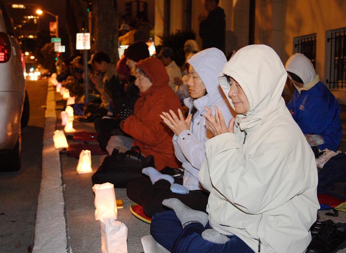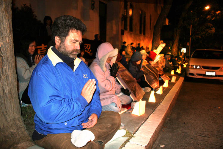 法轮功学员在旧金山中领馆前举办烛光纪念“四·二五”八周年活动,吁制止迫害。