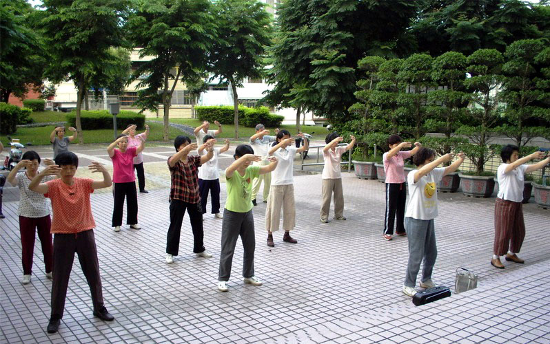 台湾中坜市健保局炼功点的学员在集体晨炼