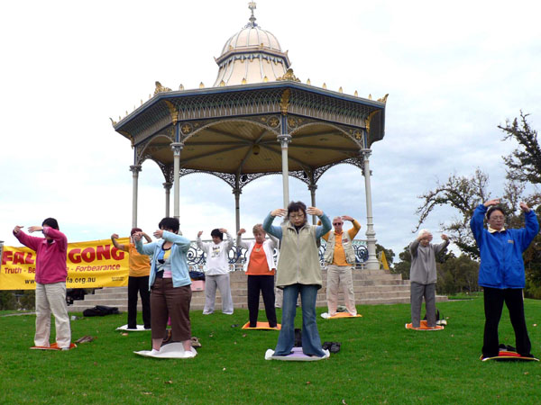 法轮功学员以讲真相方式纪念“四•二五”图为在公园炼功展示法轮大法的美好