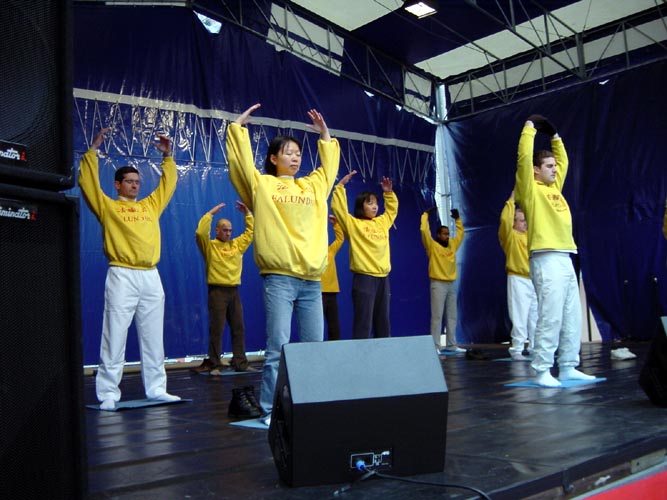 爱尔兰法轮功学员参加Dun Laoghaire举办的世界文化节,图为优美如画的功法演示