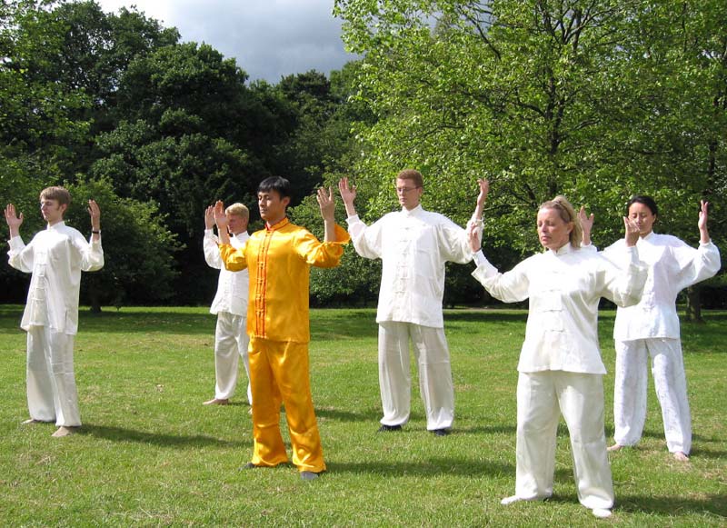 英国法轮功学员参加学府之城牛津的市长就职庆典游行,图为游行后学员在公园演示法轮功功法
