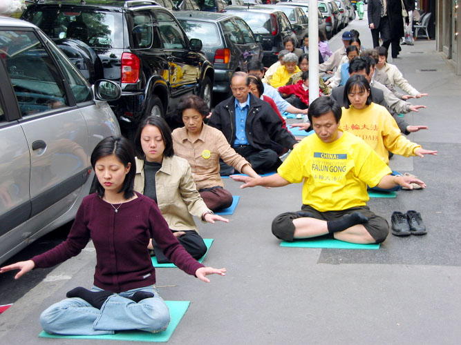法轮功在冰岛;冰岛人民游行支持法轮功 图为学员在炼功