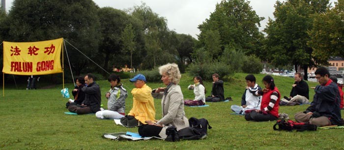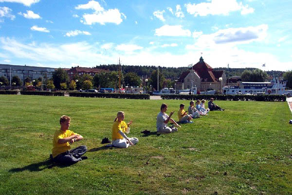 针对江泽民政府残酷迫害大法弟子的真相 北欧大法弟子利用夏日假期,展开了“紧急救援”北欧行的活动。图为大法弟子洪法炼功