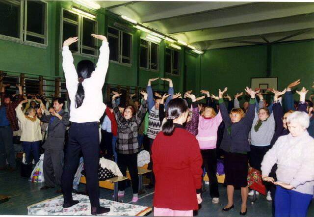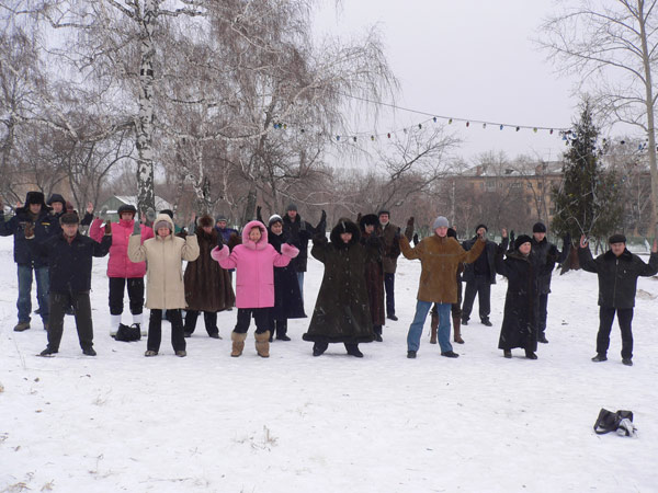 法轮功学员在乌克兰杰尔仁斯科传播大法并揭露中共的暴行.图为学员们集体炼功..2007-12-15