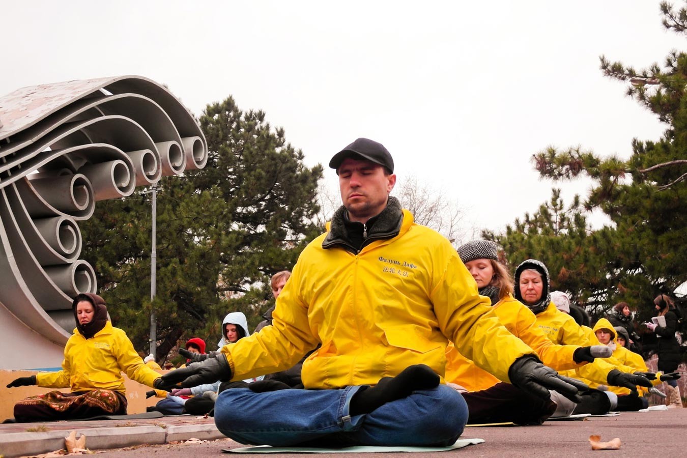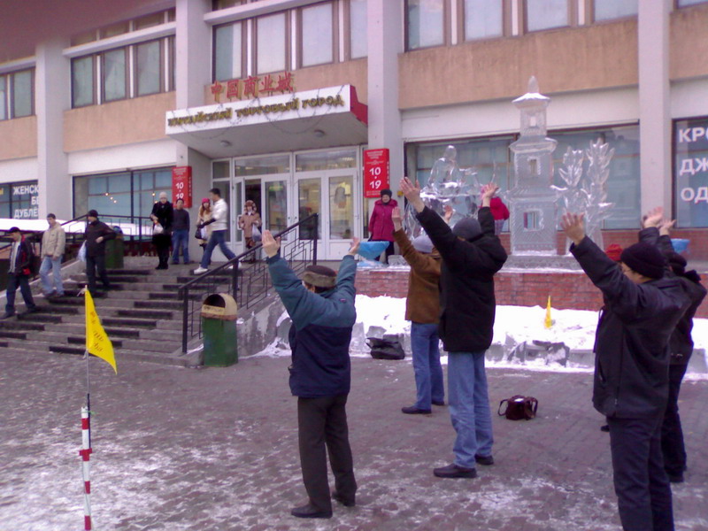 法轮功学员在俄罗斯阿巴干举办集体洪法讲真相活动图为集体炼祥和的五套功法