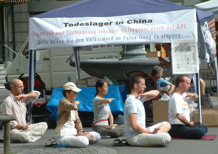 法轮功学员在瑞士苏黎世帕拉德广场揭露中共的罪行图为祥和宁静的功法演示2007-5-26