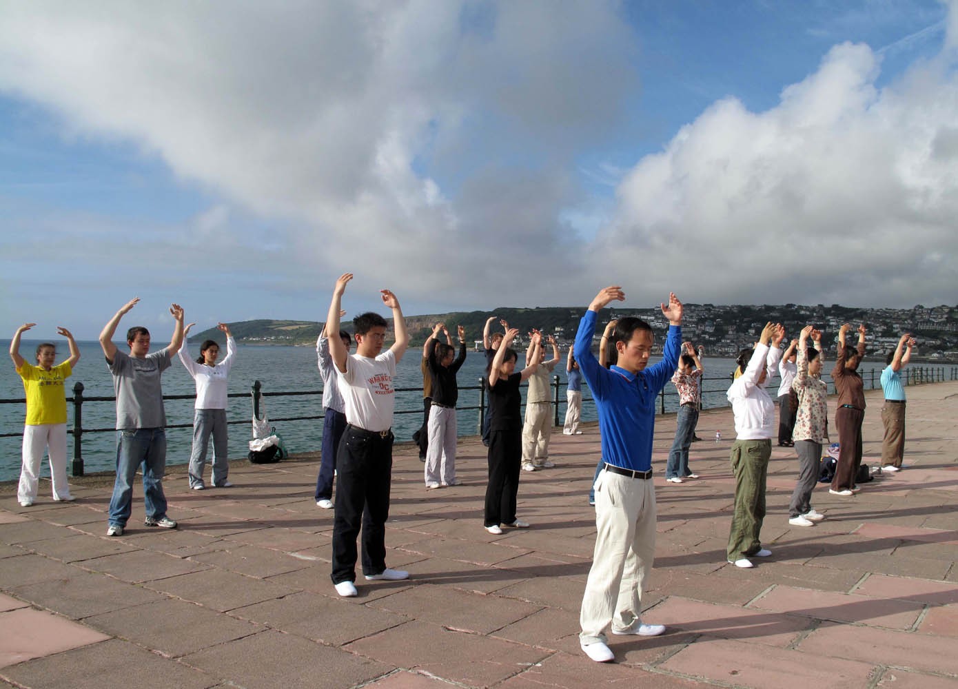 法轮功学员清晨在Penzance海边集体炼功