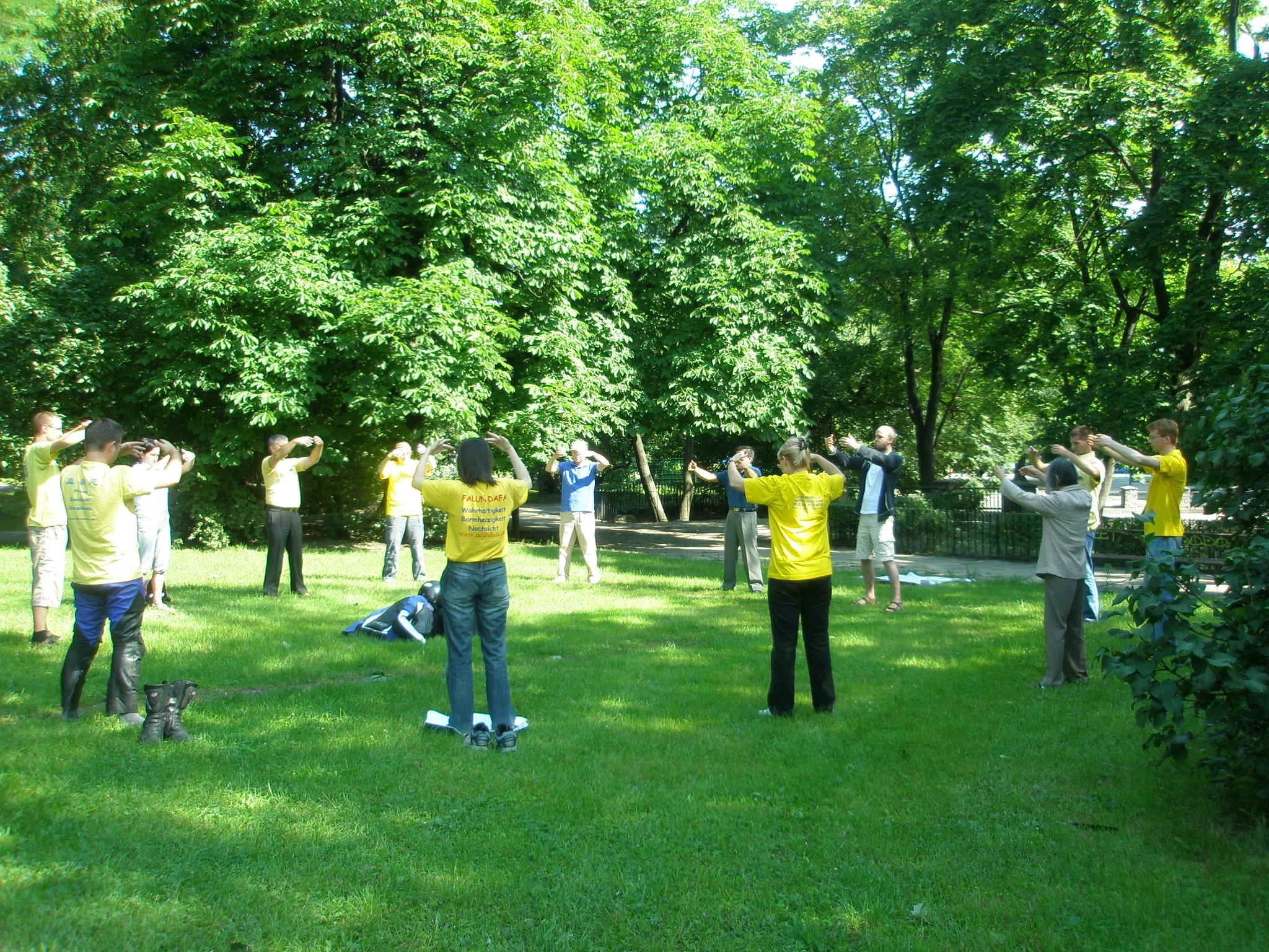 法轮功学员在瑞士伯尔尼玫瑰公园举行活动庆祝世界法轮大法日,图为集体炼功 2008-5-17