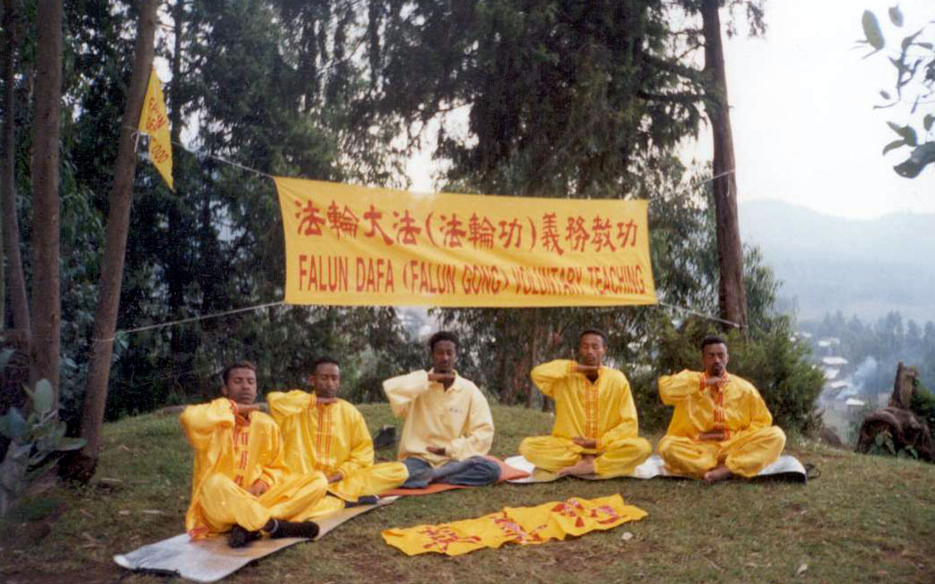 法轮功学员在非洲乌干达新成立的炼功点上集体炼功
