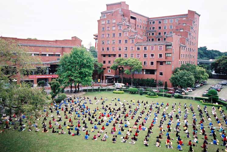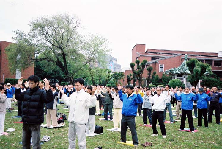 法轮功学员在台湾的发祥地台南府城高农广场的南农炼功点炼完功后集体学法交流
