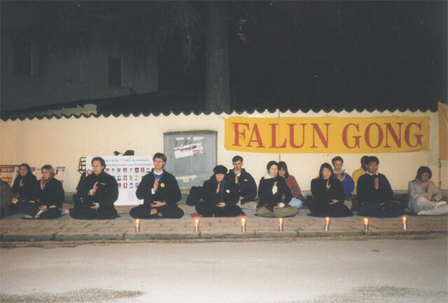 法轮功学员在世界经济论坛在瑞士举行期间揭露中共的暴行图为学员在活动后学法交流
