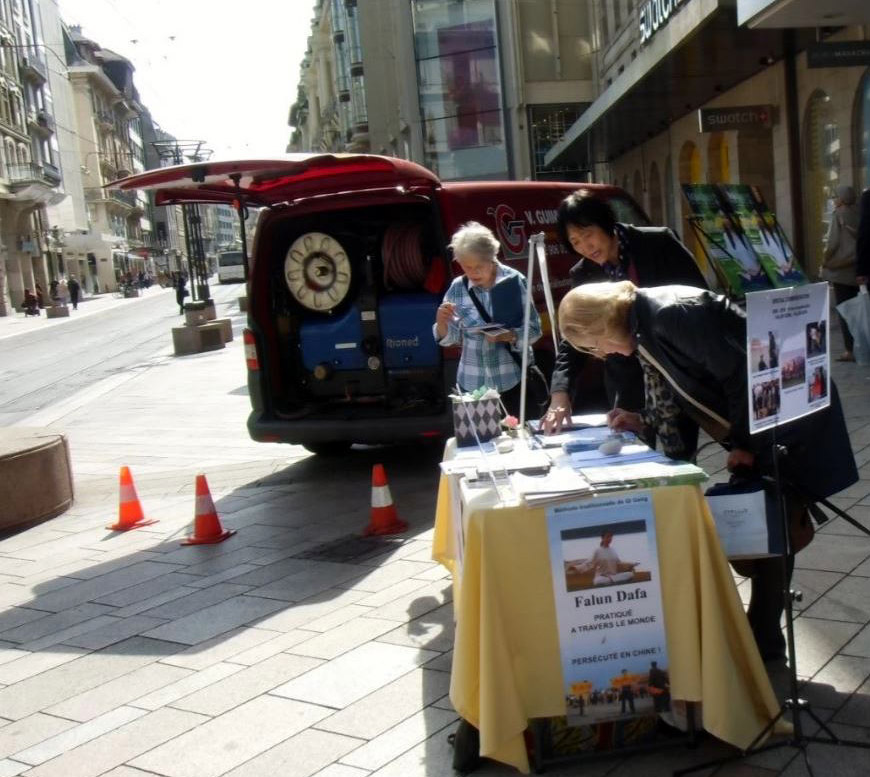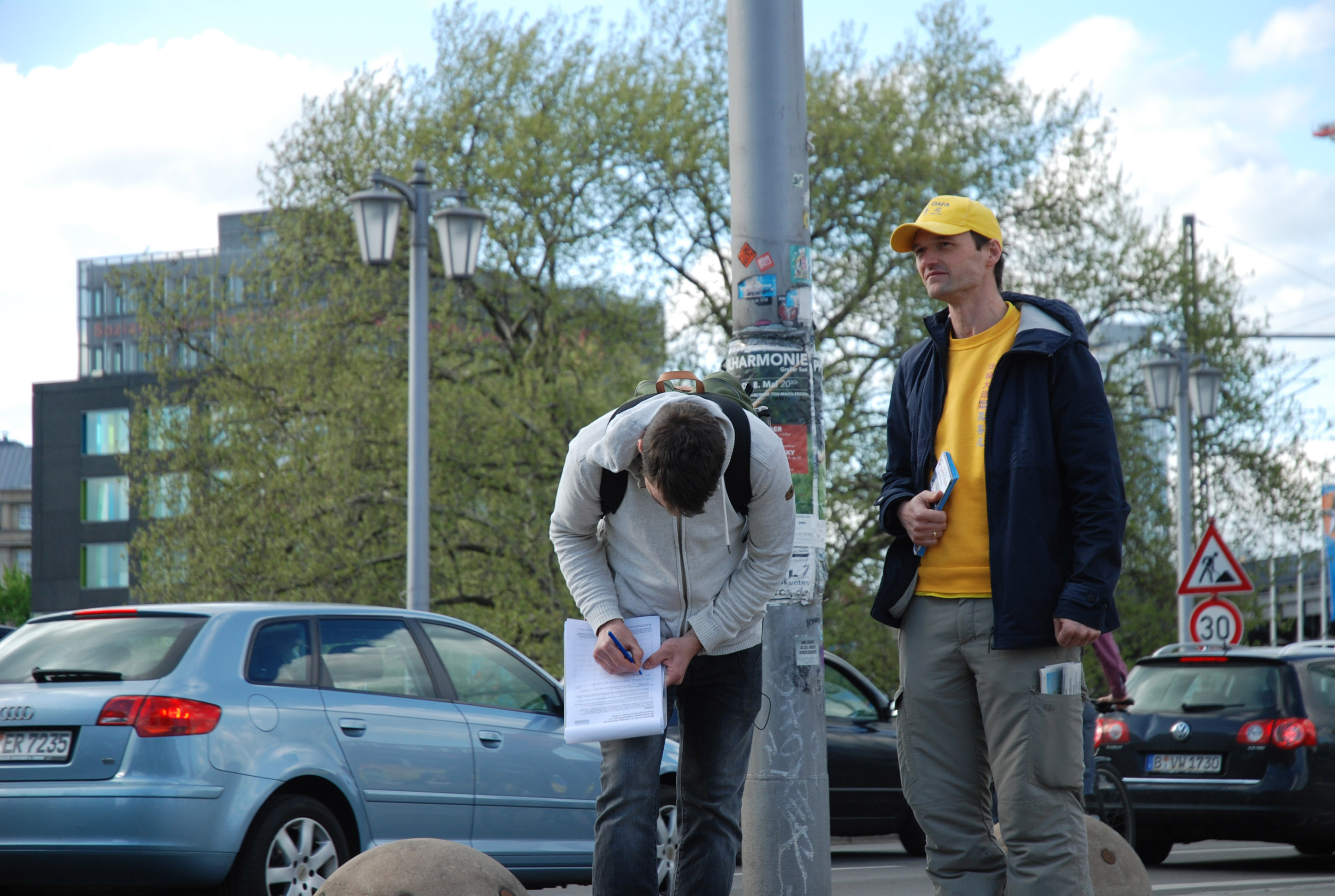 法轮功学员在弗莱堡市,举办信息日,纪念“四·二五”十九周年