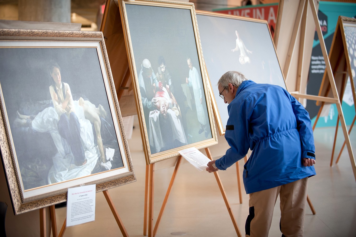 参观者认真了解画作和法轮功真相