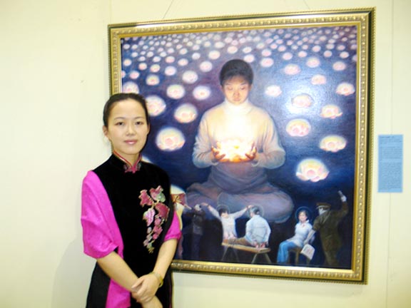 波士顿学员举办“真、善、忍”美术展 艺术家陈肖平女士与她的展出画作《誓约》