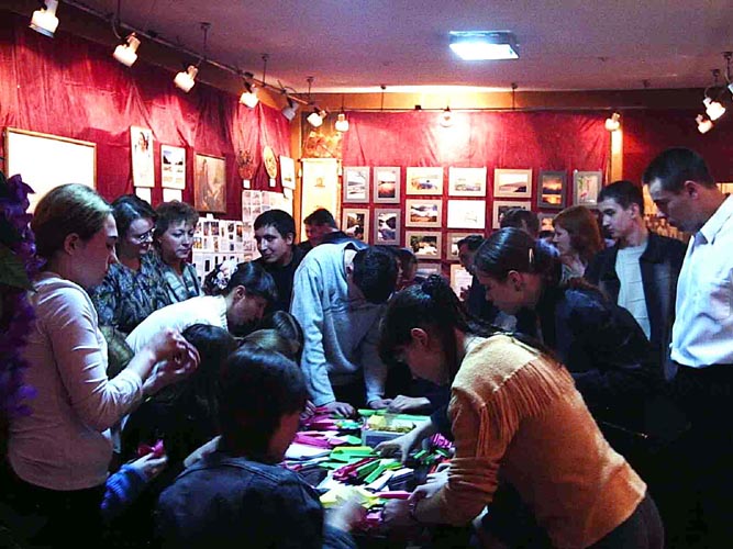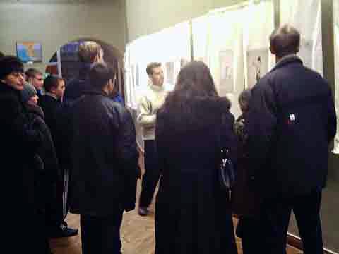 俄罗斯五山城法轮功学员到斯达夫罗博力边疆洪法 图为在五山城学员炼功的俱乐部举办画展