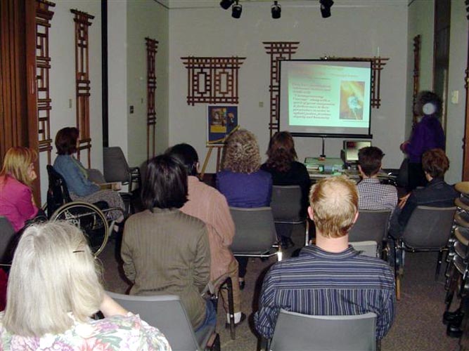 法轮功学员在多伦多大学举办“坚忍不屈的精神”艺术展 画家陈肖平现场介绍参展作品