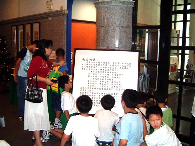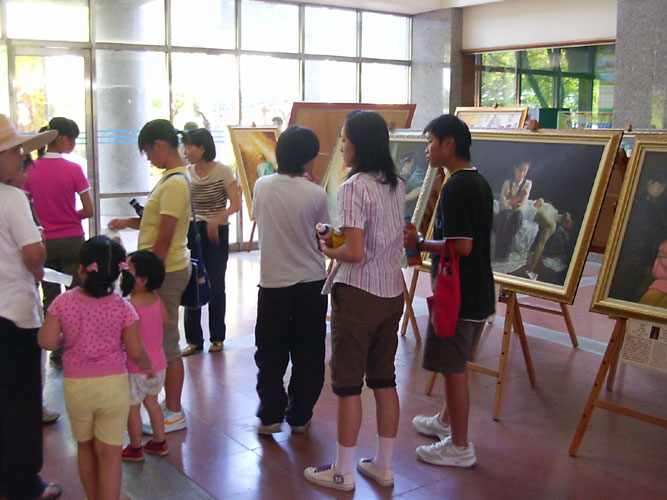 台湾法轮功学员举办真善忍国际美展,巡回展览至云林县,图为小学生参观美展