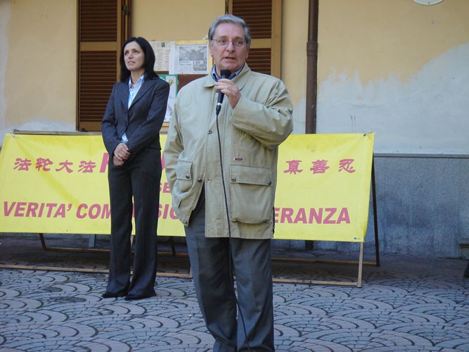 真善忍国际美术展在比利时瑞姆斯特镇展出 图为镇长兼议员的普曼斯先生在开幕式发言