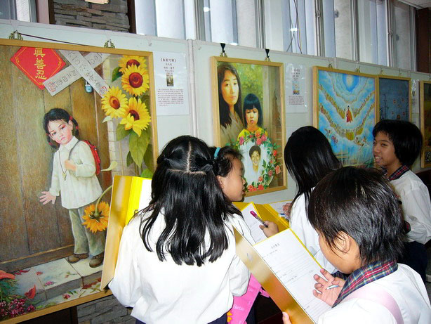 台湾花莲法轮功学员举办真善忍美展 图为小学生户外教学──观画