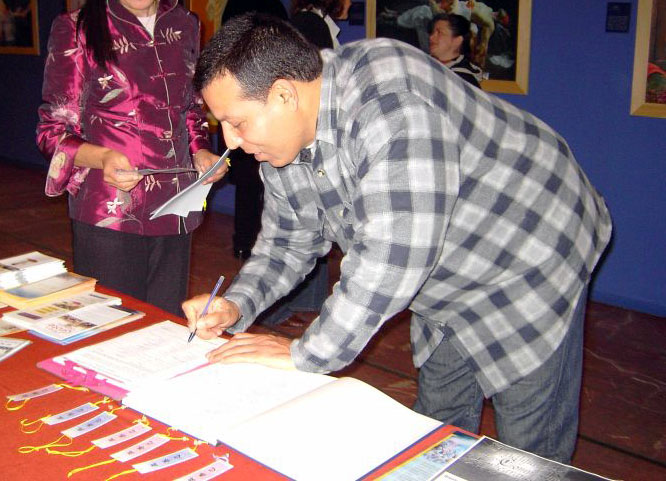 加拿大“真善忍”巡回画展在卡尔加里(Calgary)艾波克(Epcor Center)表演艺术中心举行 图为观众在留言簿上签字留言