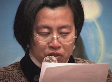 真善忍国际美展在台中大甲揭幕 图为来宾致词申贺忱