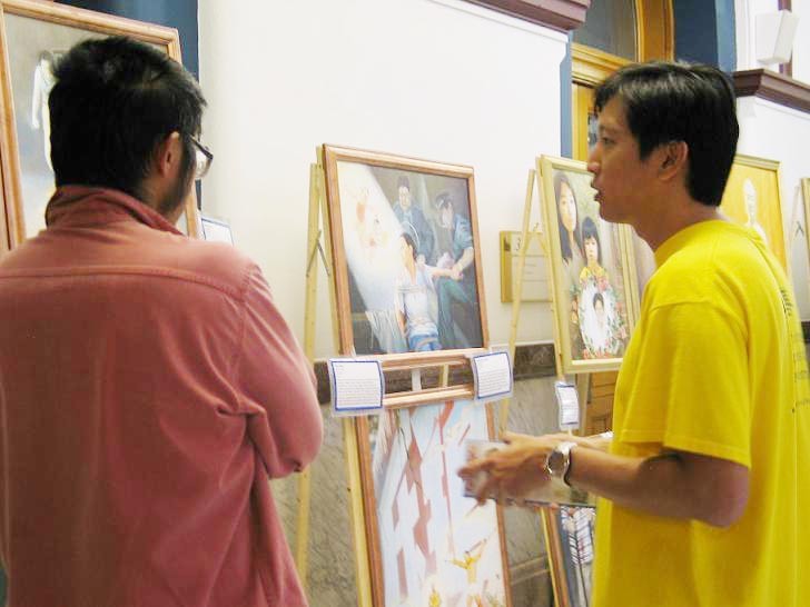台湾花莲法轮功学员举办真善忍美展 图为导览员解说画作内涵