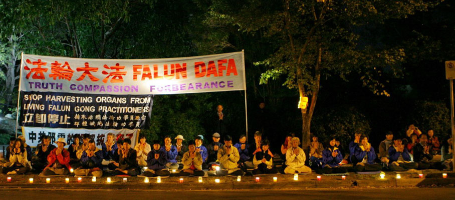 悉尼法轮功学员在中领馆前举行烛光纪念“四·二五”图为原中国科学院研究员