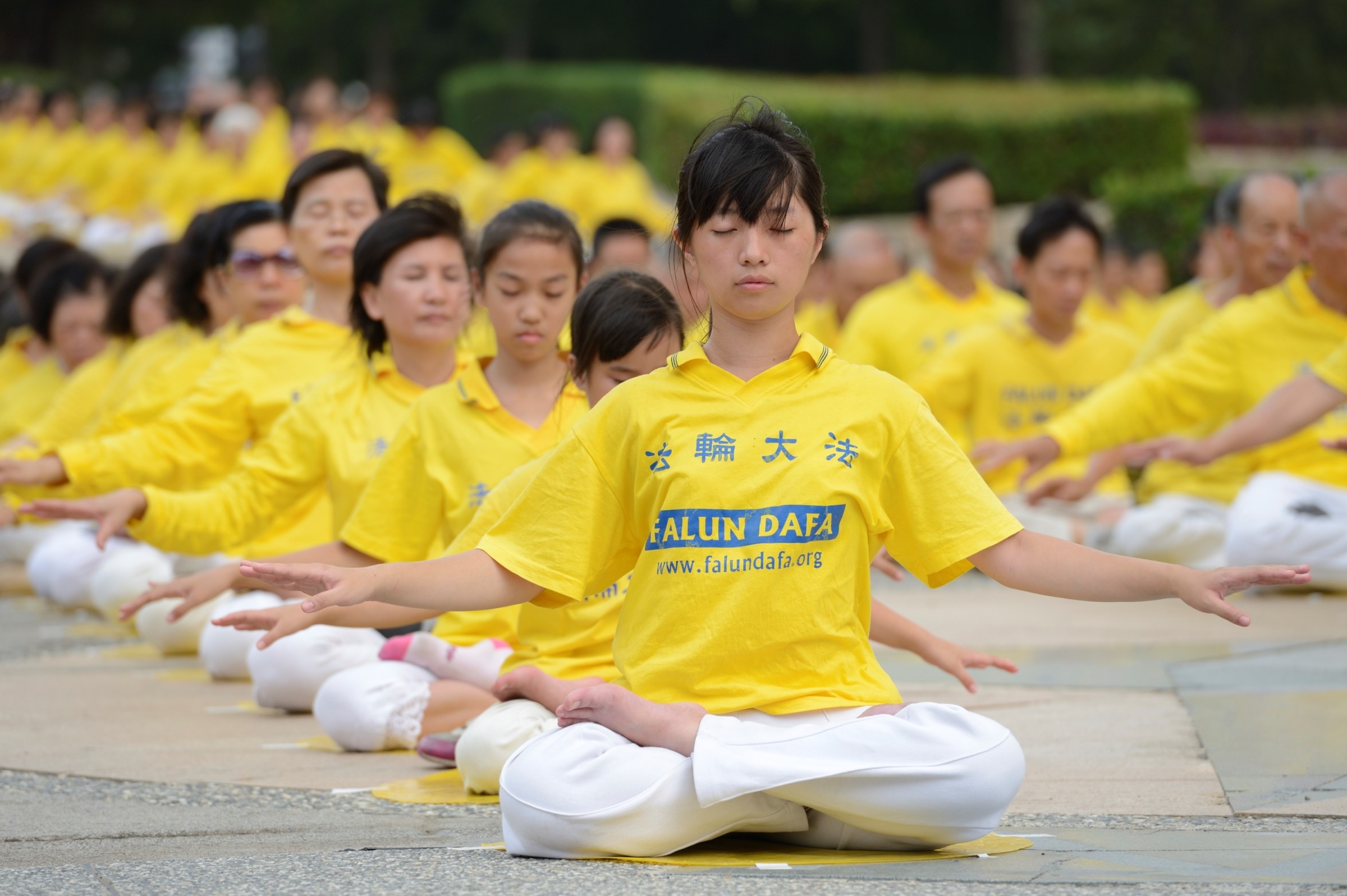 法轮功学员集会悼念被迫害致死的同修.图为民众学炼功法