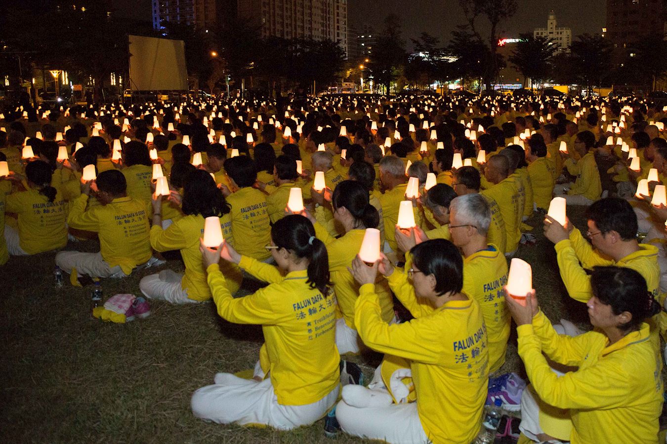 法轮功学员在公园集体炼功,并举行烛光悼念长达十三年的迫害