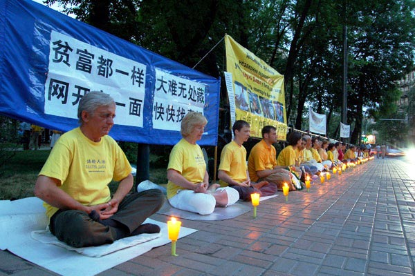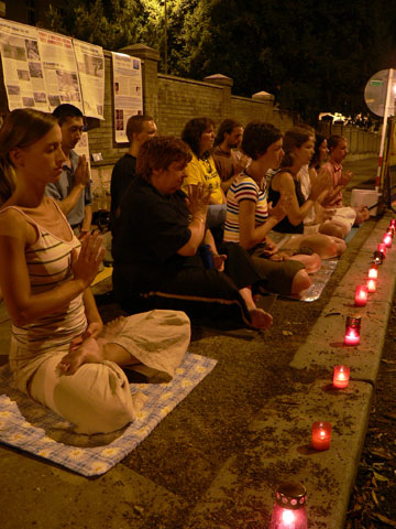 法轮功学员在乌克兰举行法轮大法修炼心得交流会图为在中使馆前举行烛光守夜2008-6-6至8