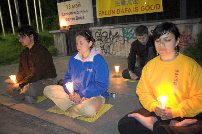 为庆祝第九届世界法轮大法日,保加利亚学员在首都索菲亚举办洪法活动,图为悼念因坚持信仰而被中共迫害致死的中国大陆同修 2008-5-13