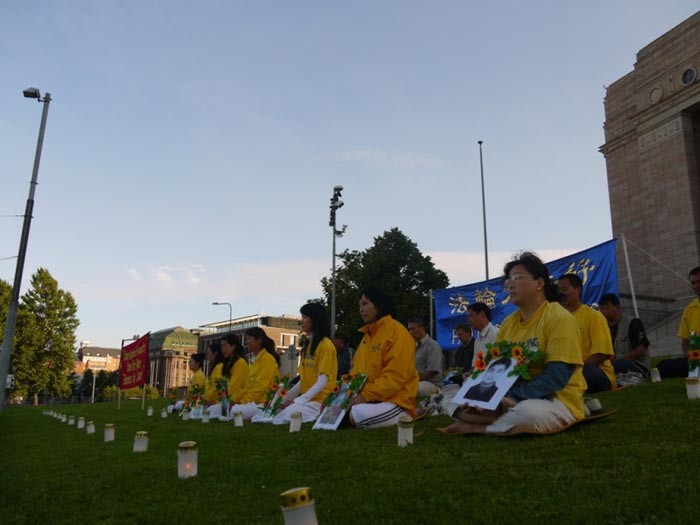 法轮功学员在芬兰国会大楼前举办烛光夜悼悼念被迫害致死法轮功学员2007-8-31