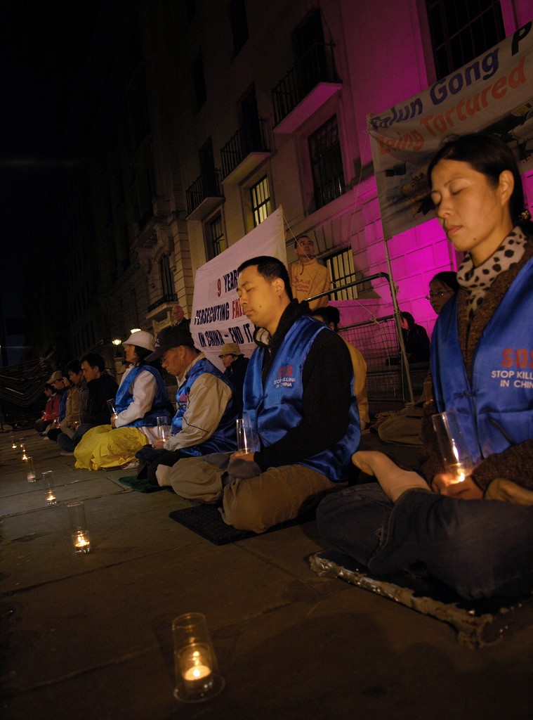 伦敦法轮功学员中使馆前举办烛光守夜 纪念法轮功“4.25”和平请愿六周年