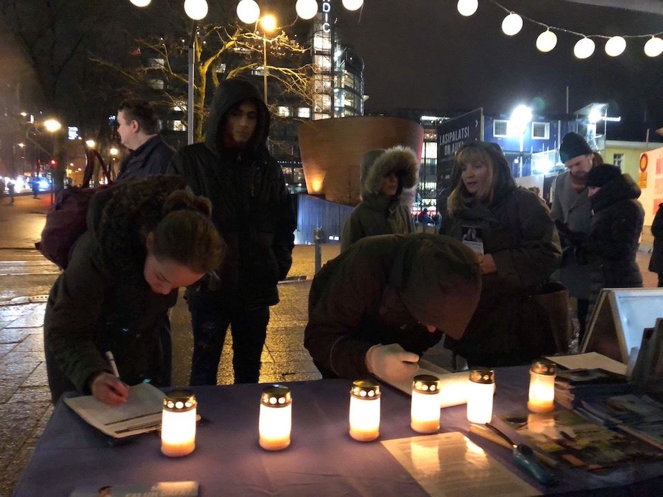 赫尔辛基火车站广场上,烛光悼念被中共迫害死的法轮功学员