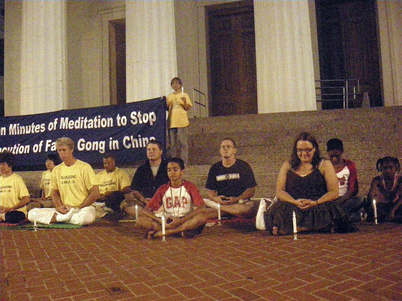 法轮功学员在圣路易旧法院前打坐,呼吁制止中共迫害许多民众加入了烛光悼念