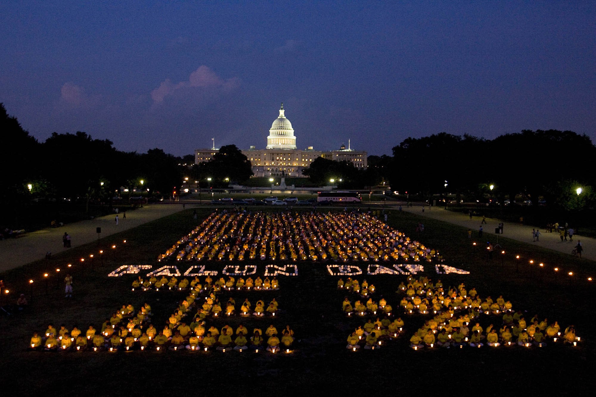 法轮功学员在美国国会山与华盛顿纪念碑之间,举行反迫害十周年烛光夜悼