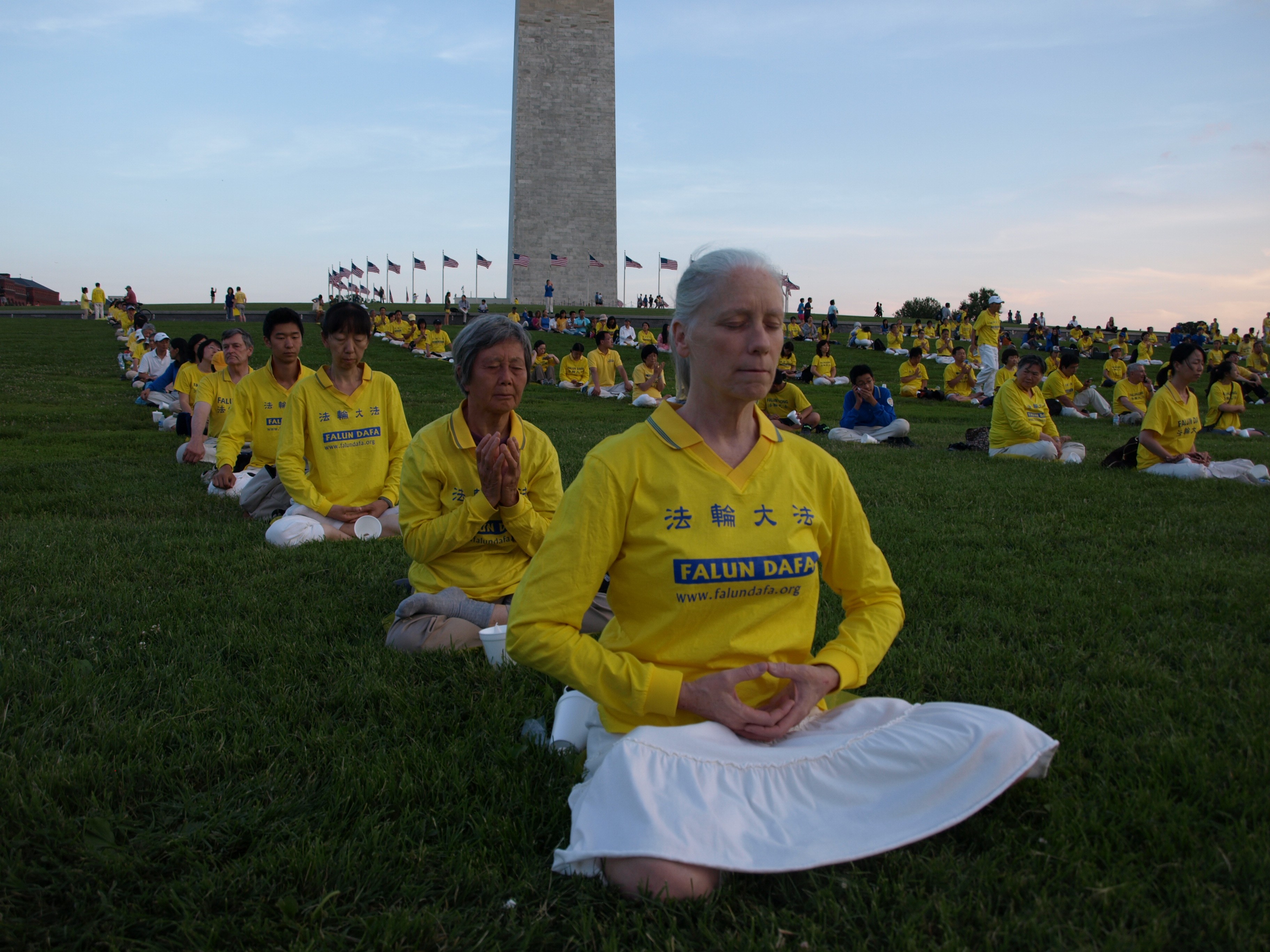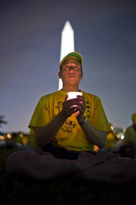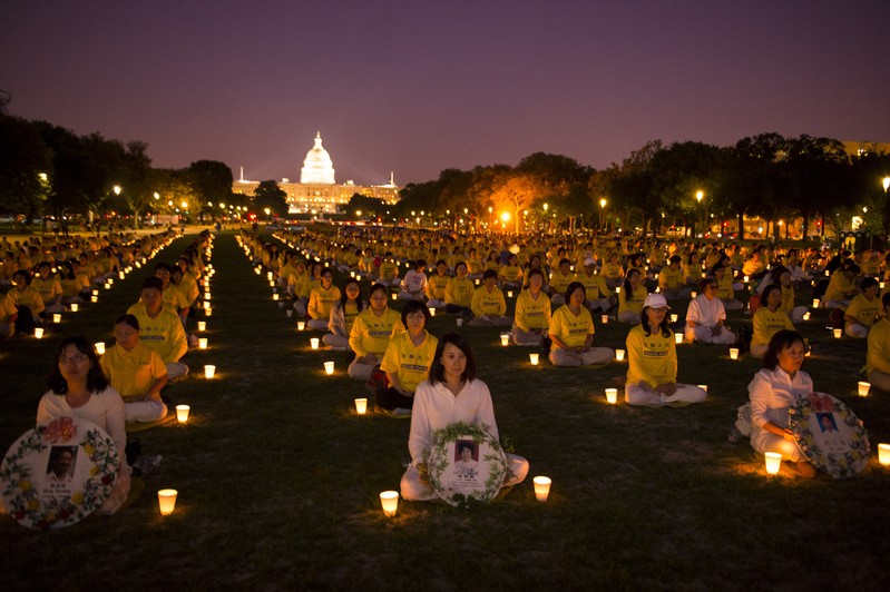 法轮功学员在华盛顿纪念碑下举行烛光守夜活动,悼念被迫害致死的法轮功学员。
