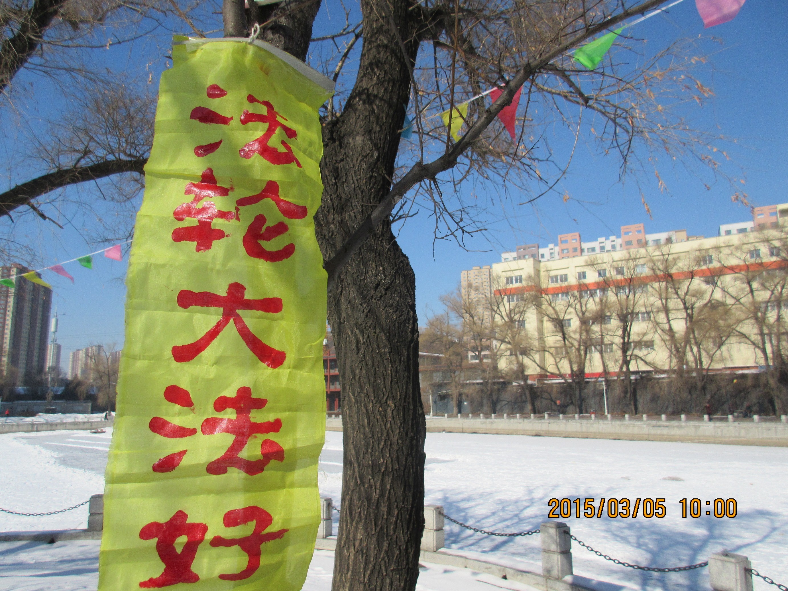 大年初一,吉林省某市法轮功学员悬挂真相条幅给人们送来春天的祝福