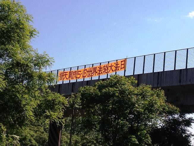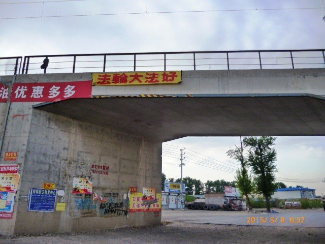 河北唐山桥梁上悬挂条幅庆祝世界法轮大法日